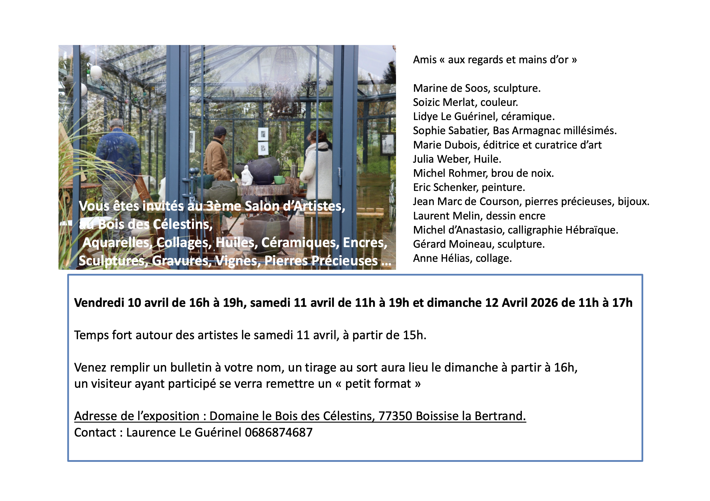 Nous avons le plaisir de participer pour la première fois au Salon d’Artistes au Bois des Célestins, réunissant des talents variés : sculpture, céramique, pierres précieuses… et bien sûr Bas Armagnac !